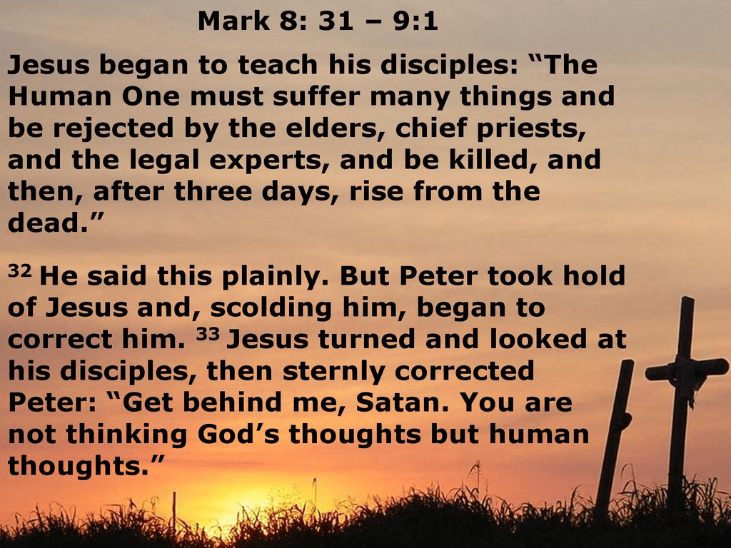 വിശുദ്ധ മാർക്കോസിന്റെ സുവിശേഷത്തിൽ ഈശോയുടെ പീഡാനുഭവ-ഉത്ഥാന പ്രവചനങ്ങൾ മൂന്നാണ്. ഇവയിൽ ഒന്നാമത്തേതാണ് ഇന്നത്തെ സുവിശേഷത്തിന്റെ ആദ്യഭാഗത്ത് നാം വായിച്ചു കേട്ടത്. വിശുദ്ധ മാർക്കോസിന്റെ സുവിശേഷത്തിലെ മറ്റ്, രണ്ടു മൂന്നും പ്രവചനങ്ങൾ ഒൻപതാം അദ്ധ്യായം 30-32 ലും, പത്താം അദ്ധ്യായം 32-34 ലും ആണ് നാം കാണുന്നത്. ഇന്നത്തെ സുവിശേഷത്തിന്റെ പരിസരം മനസ്സിലാക്കുവാൻ, തൊട്ട് മുൻപുള്ള പത്രോസിന്റെ വിശ്വാസപ്രഖ്യാപനം ഇതിനോട് ചേർത്ത് പറഞ്ഞുപോകേണ്ടതാണ്.